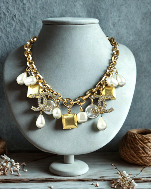 Cream Marble Collar Necklace – Dual-Strand Statement in Beads & Gold Accents