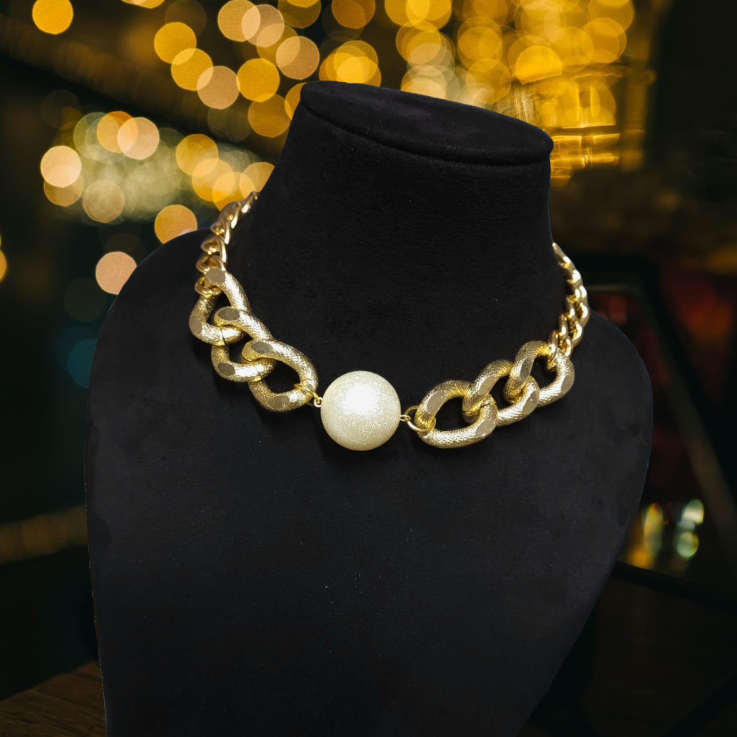 Bold Luxe Gold Chain Choker with Textured Links & Pearl Centrepiece – Anti-Tarnish Imitation Necklace